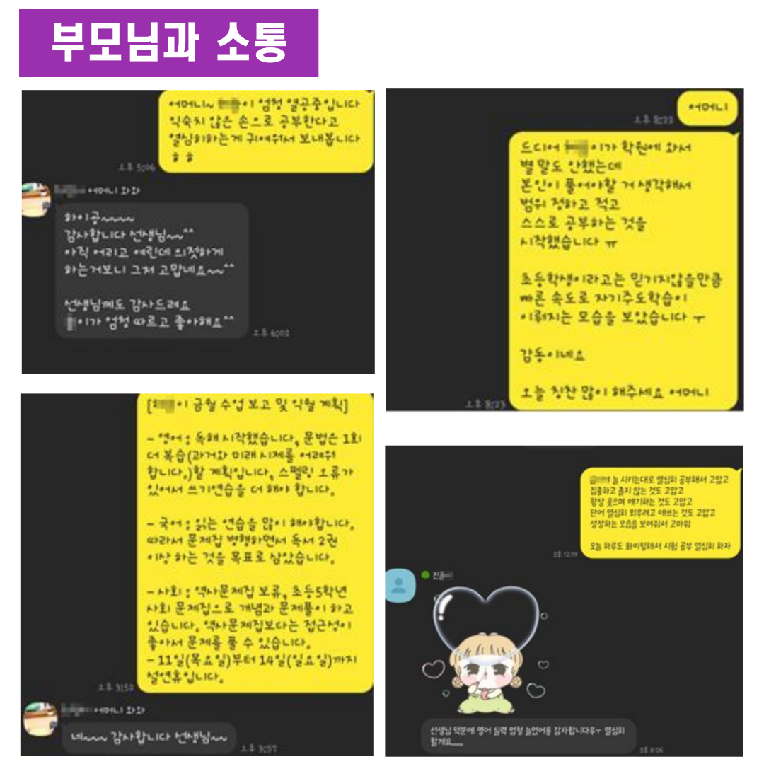 아이의 학습 진도와 태도를 매 수업 후 학부모님께 투명하게 보고합니다. 선생님과 학부모님의 원활한 소통은 아이에게 긴장감을 주는 동시에 든든한 지원군을 얻게 합니다. 집에서 이루어지는 수업이지만, 그 어떤 대면 과외보다 철저한 밀착 관리를 경험하실 수 있습니다.